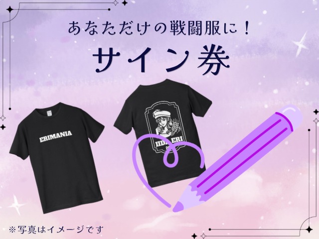 飯田愛梨オリジナルTシャツをご購入の方のみのオプションとなります。 【記入内容】 お名前・サイン 【記入場所】 背面空きスペース ※ハンドルネームを備考欄へ御記入ください。ない場合、本名での名前入れとさせていただきます。
